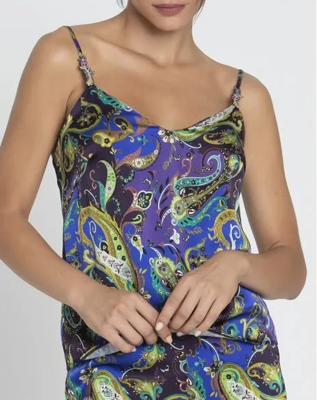 Le Caraco Lise Charmel de la collection Dentelle Cashmer offre un joli décolleté et un dos dégagé, proposant une matière soie imprimé du motif créatif propre à cette gamme, le même motif et la même matière que la corseterie pour un ensemble harmonieux et une silhouette sublimée.