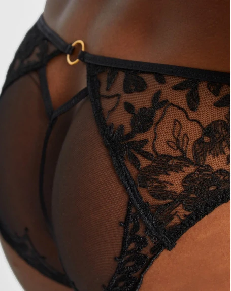 La culotte mini cœur After Midnight de la marque Aubade offre un sublime jeu de transparence et d’opacité grâce à sa broderie et sa laize brodée florale. Son anneau doré lui apporte une touche de couleur et un côté sensuel.