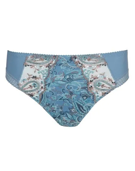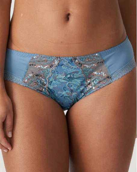 Elégant slip brésilien en voile léger, ornée de fines broderies brillantes. La coupe plus haute d’un slip brésilien rend vos jambes plus longues et plus minces.