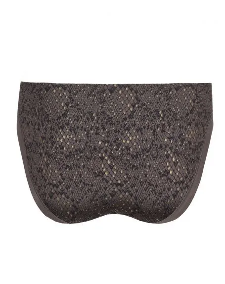 Slip brésilien lisse en tissu satiné brillant à imprimé serpent. Un tulle ludique sur les jambes complète votre look. La coupe échancrée du slip brésilien vous offre une silhouette élégante.