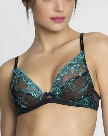 Le soutien-gorge glamour Secrète Emeraude de la marque Lise Charmel offre un décolleté sensuel plongeant doté d’un galbe arrondi. Il met en valeur la poitrine. Egalement orné de sa dentelle Leavers fine et légère, il apporte un confort optimal.