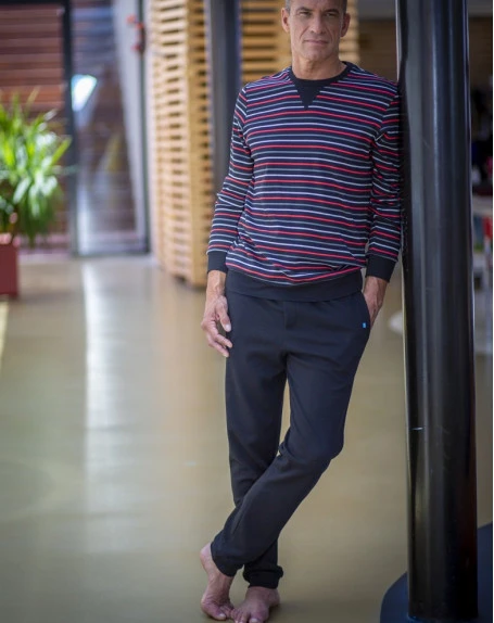 La tenue d’intérieur Toronto de la marque de lingerie HOM propose un look casual, ce pyjama composé de coton interlock est confortable dans un coloris moderne en rayures rouges et grises sur un fond noir.